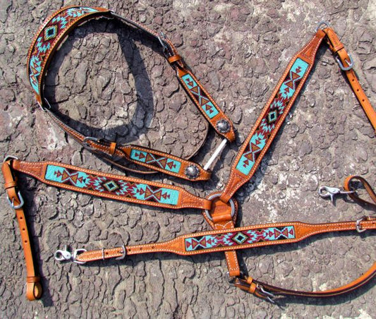 Argentina Cow Leather Headstall and breast collar 3 piece set with aztec beaded inlay