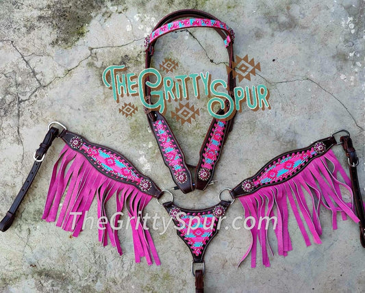 READY TO SHIP- Pink Aztec tack set with pink fringe