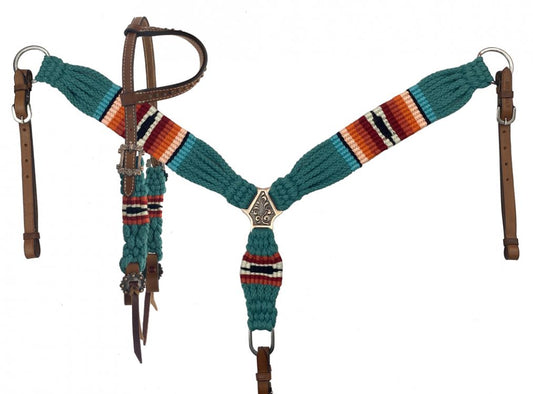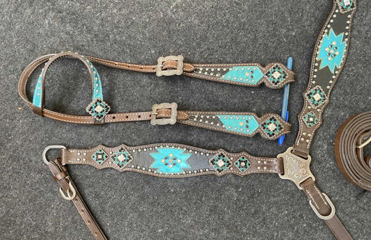 Argentina Cow Leather 3 Piece Headstall and breast collar set with navajo beaded inlay