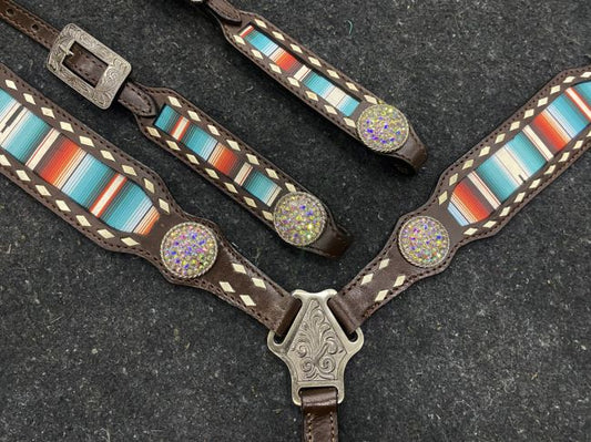 Serape Southwest Print One Ear Headstall and Breastcollar Set with bling conchos