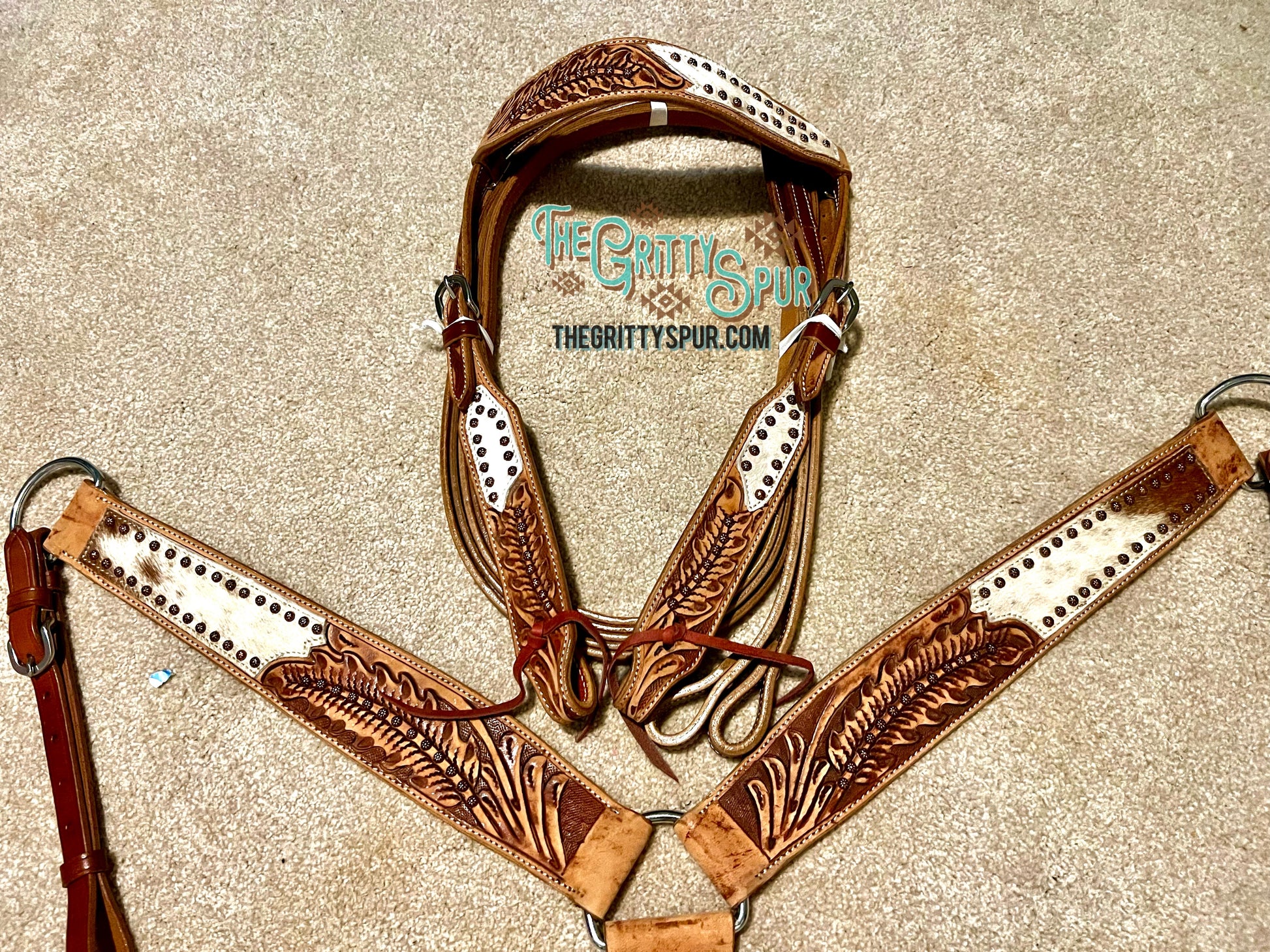 This Browband Headstall and Breastcollar Set is a stunning and elegant addition to any horse tack collection. Crafted from premium, medium oiled leather with intricate leaf tooling, this set showcases a beautiful natural motif that exudes a sense of sophistication and style. The cowhide overlay adds a touch of rustic charm, blending seamlessly with the classic design. Copper studs add the perfect finishing touch and just a bit of shine to make this tack set stand out.Â