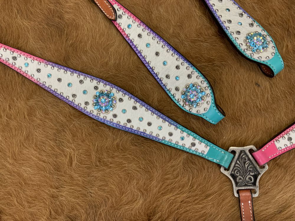 Cowhide inlay One Ear headstall and breast collar set with Ombre Colored rainbow leather with beads and bling conchos and silver hardware. This set features a Ombre colored leather with a hair on cowhide inlay. Set is accented with a silver beading and bling Conchos. Headstall comes with 5/8" x 7' leather split reins.