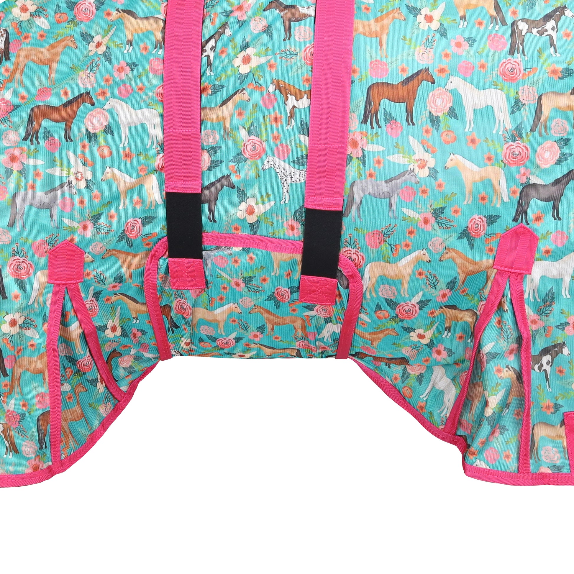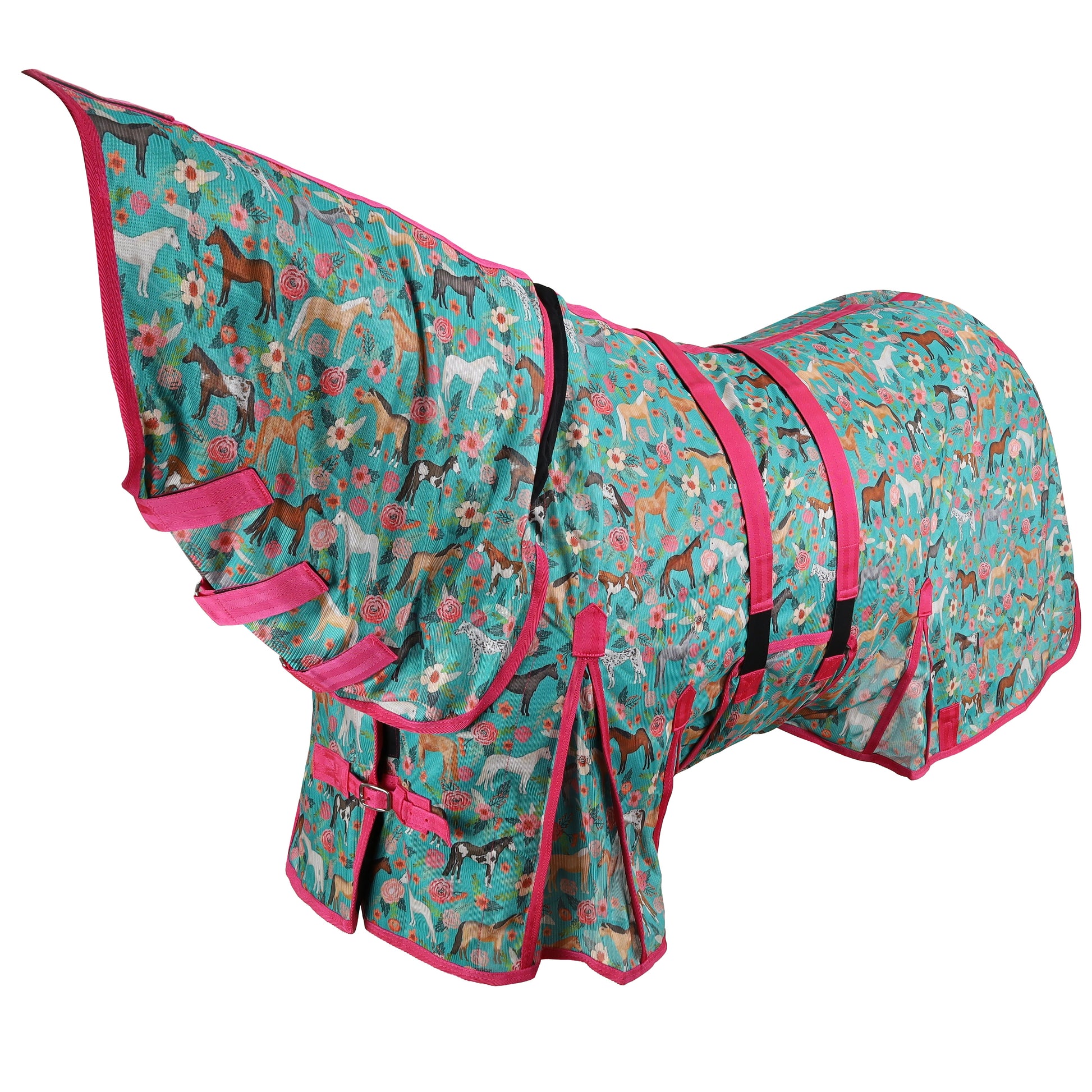 Designed for maximum breathability and protection, this lightweight mesh fly sheet offers superior coverage against flies, dust, and harmful sun rays. The vibrant teal design features an eye-catching horse and flower print, complemented by a pink lining for a stylish pop of color.