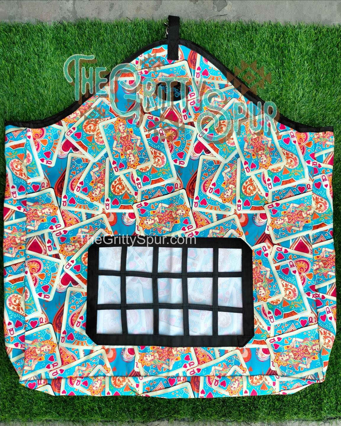 This Queen of Hearts print hay bag is gorgeous!! With slow feed style holes in the front your horse will enjoy snacking on hay for a longer period of time. Consistent hay helps the gut!