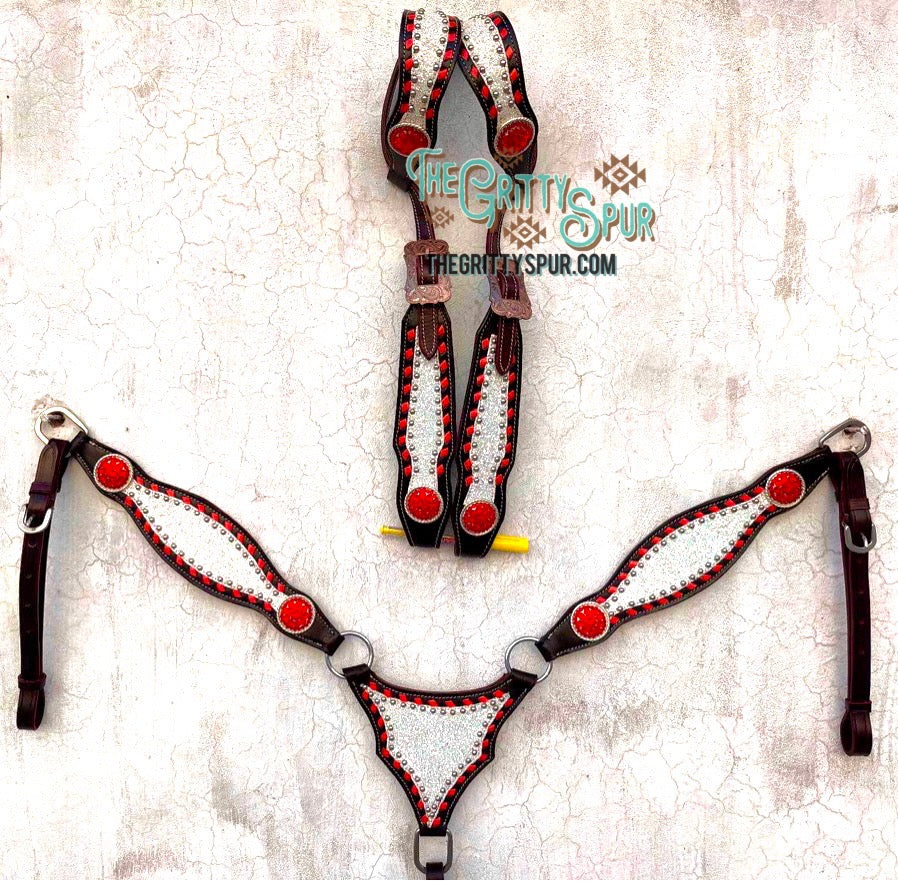 Horse size tack set with red buckstitch and glitter inlay. This set is ELEGANT! Its flashy but classy!