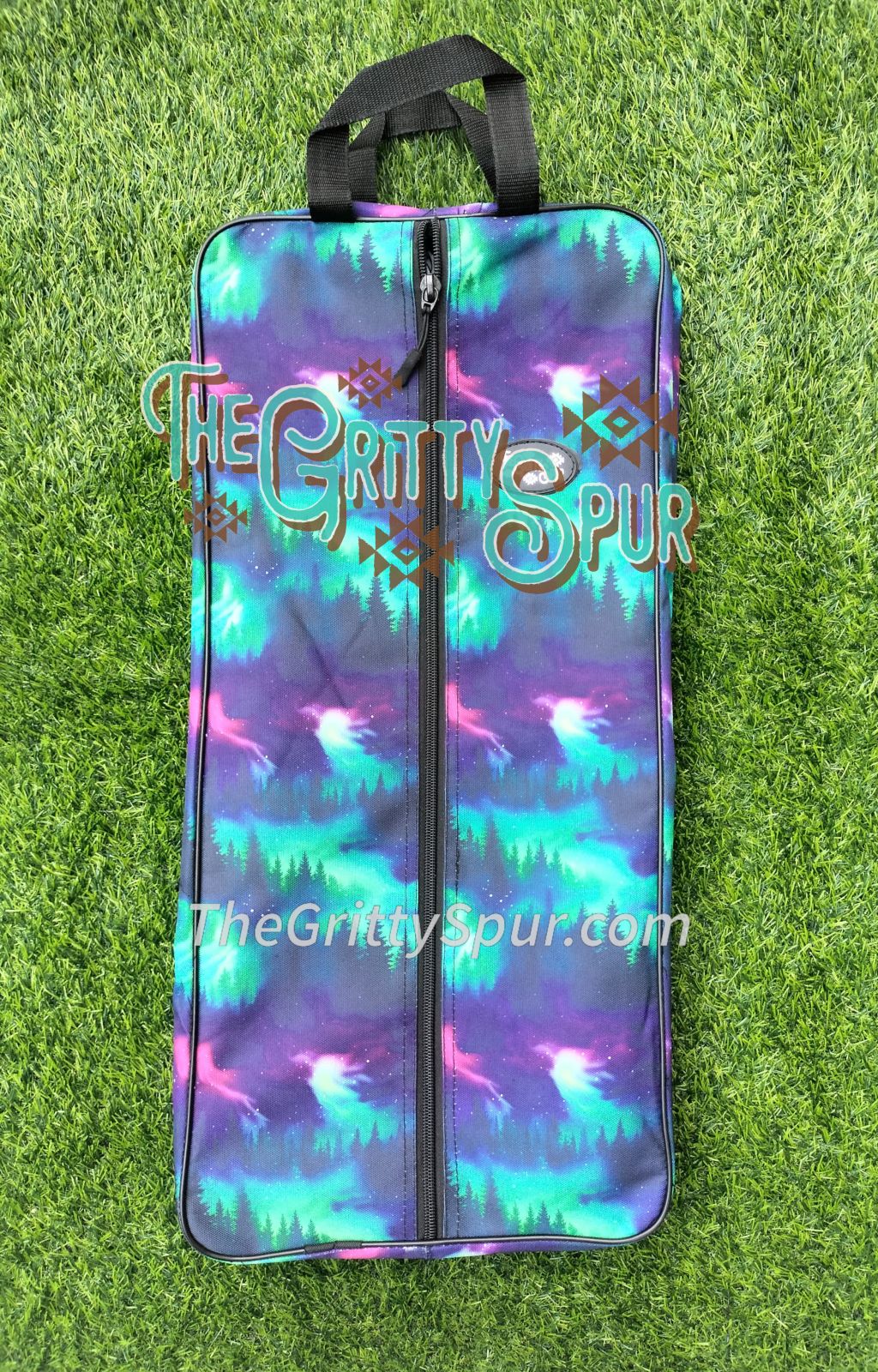 Introducing the Northern Lights Bridle Bag - the perfect accessory for your equestrian gear. With a built-in clip, it securely holds your bridles, while also providing enough space to hold full tack sets. Stand out and make a statement with our prints!