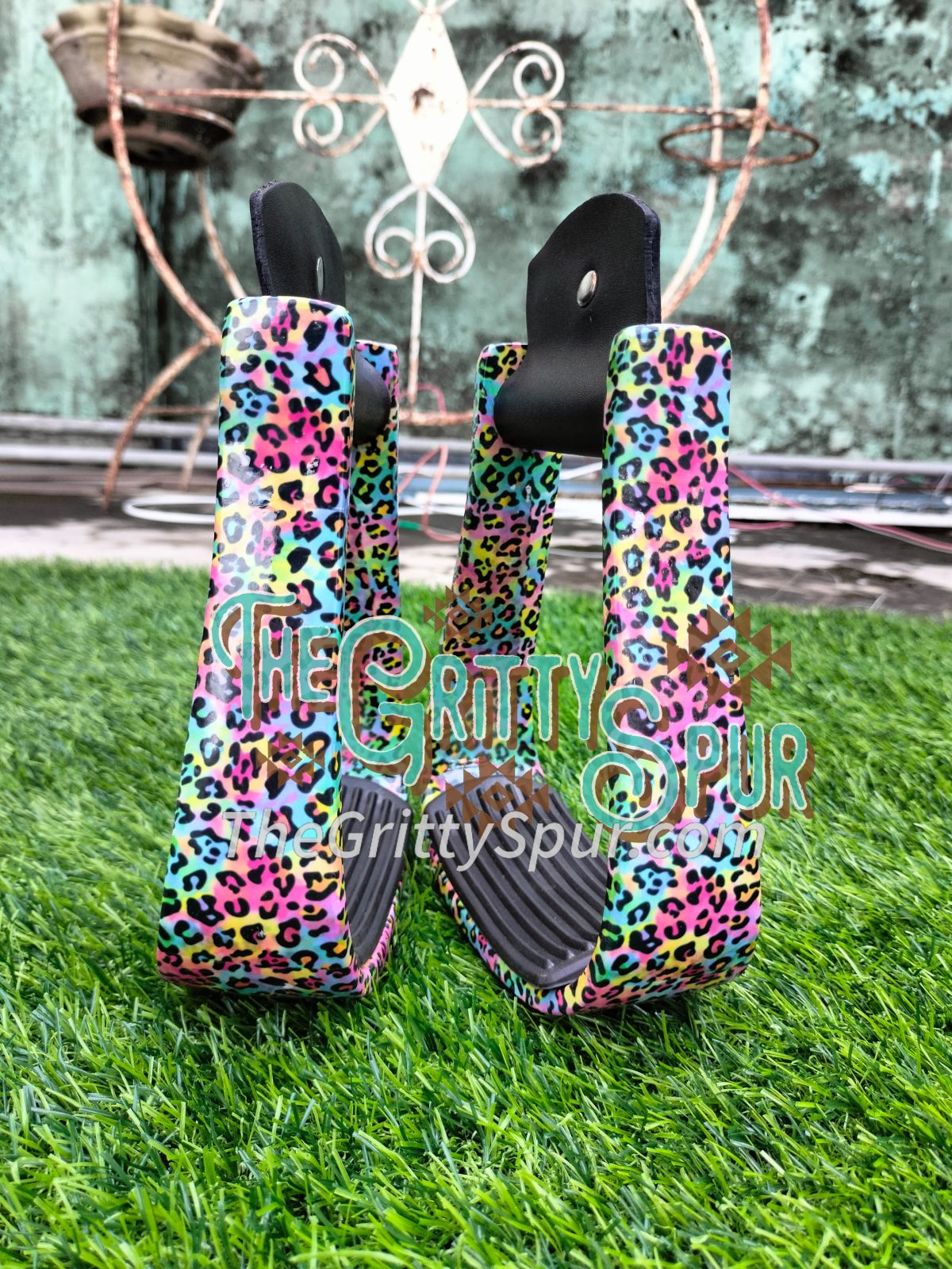 Rainbow cheetah pattern stirrups for western saddles. If the listing doesn't say pre order at the top then they are in stock. If it says pre order it will be 20-50 business days to restock. You can still order to reserve your pair.