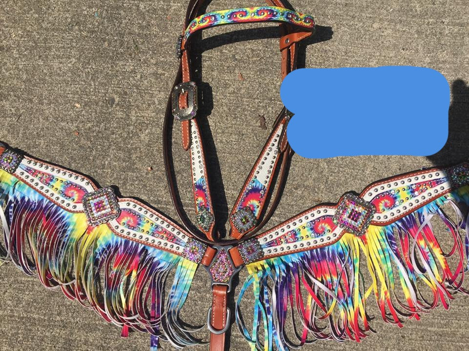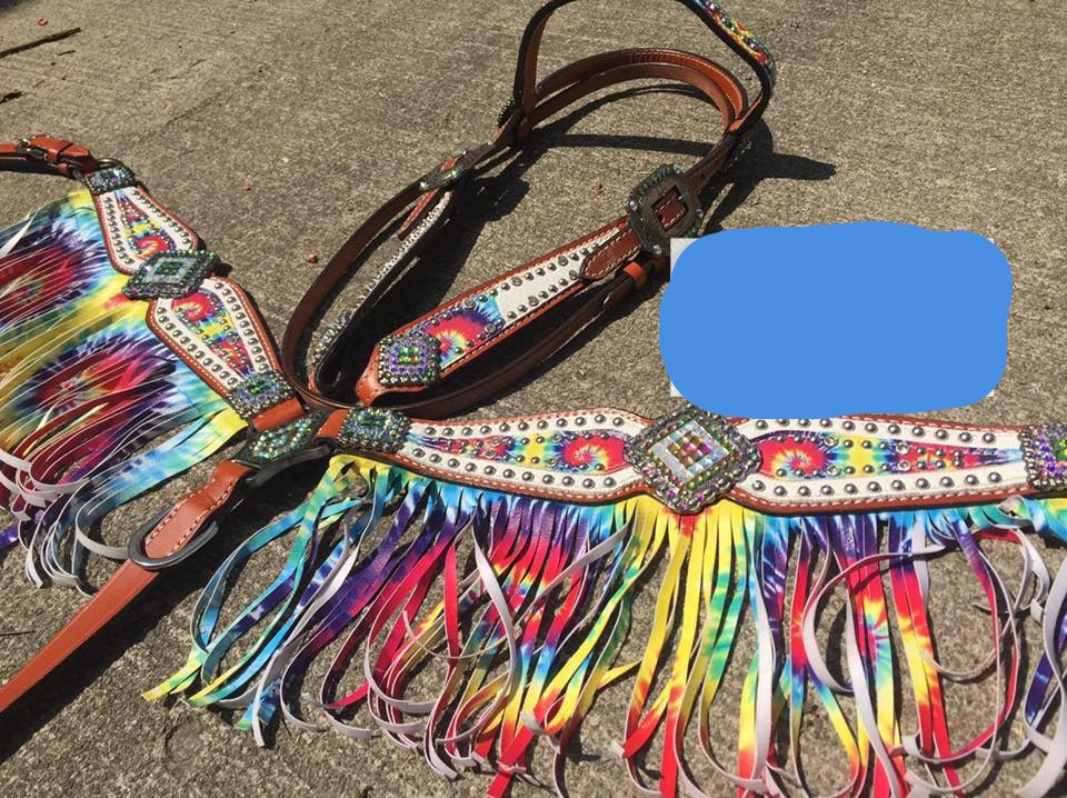 Rainbow tie dye headstall and breast collar set. This set features medium leather with rainbow tie dye and white leather overlays accented with silver studs and crystal rhinestones. Hardware and oversized conchos are adorned with iridescent rhinestones. Headstall comes with 5/8" x 7ft leather split reins.