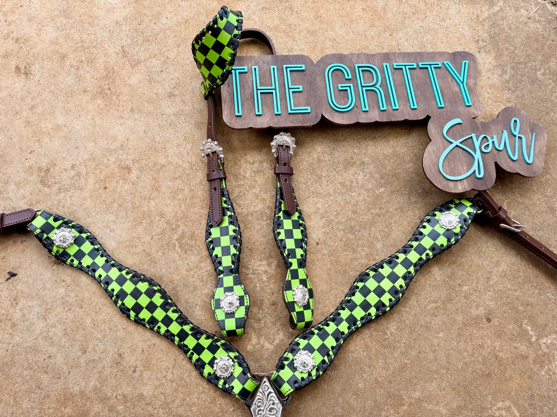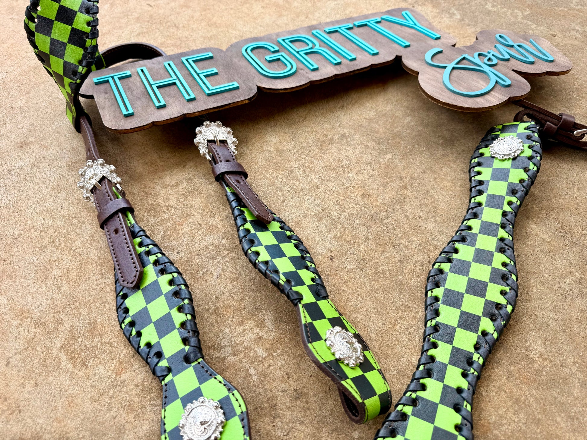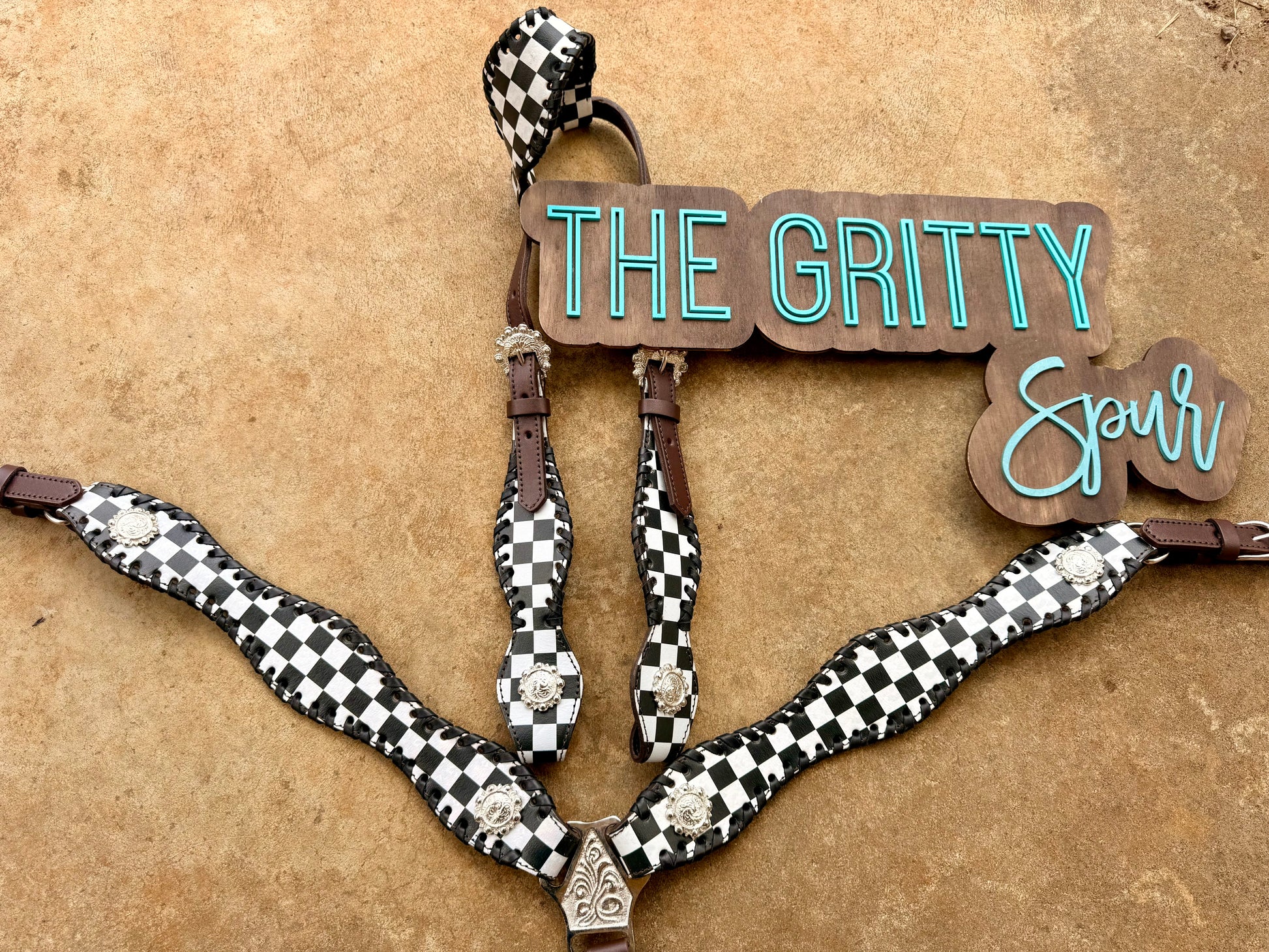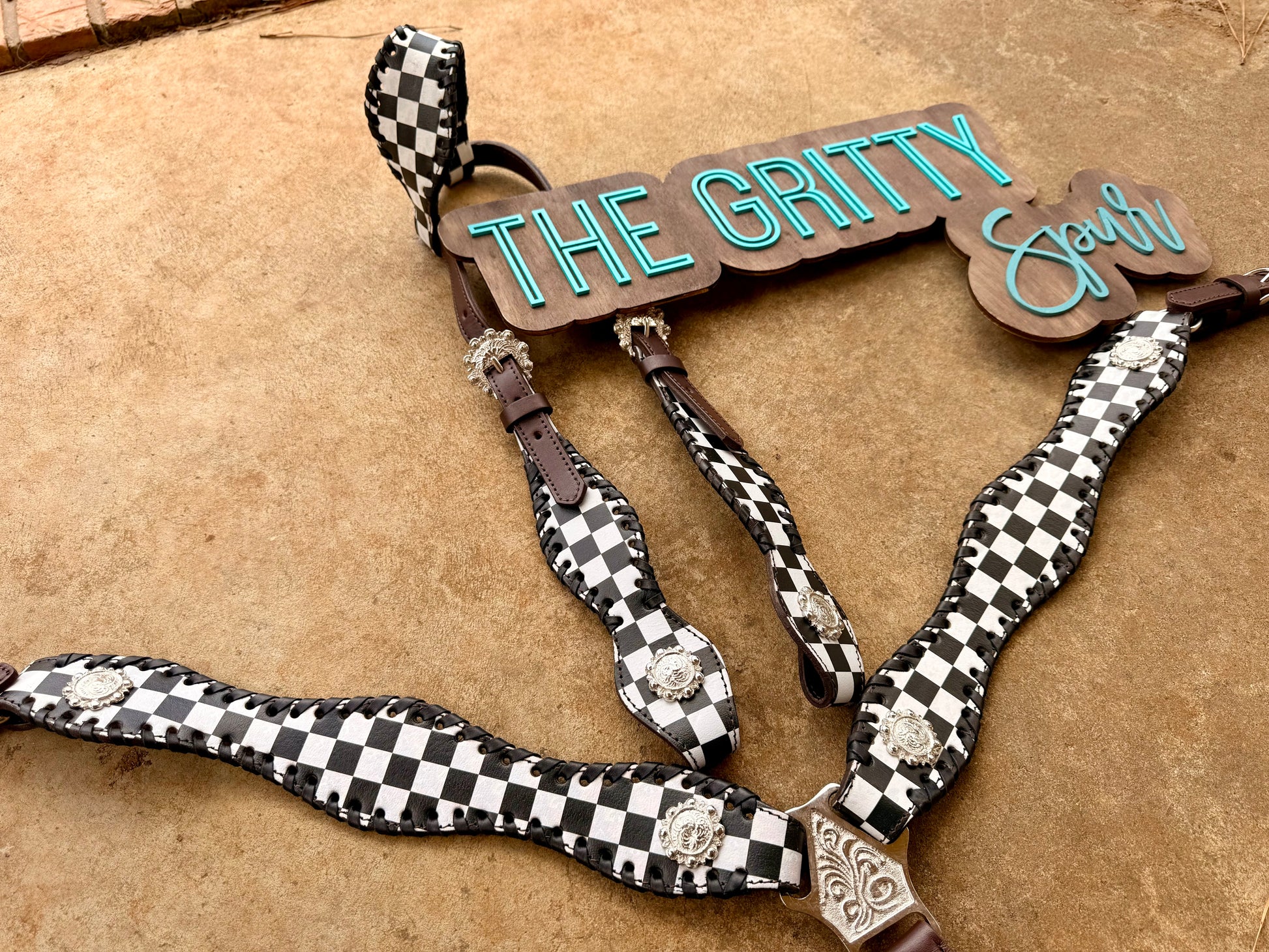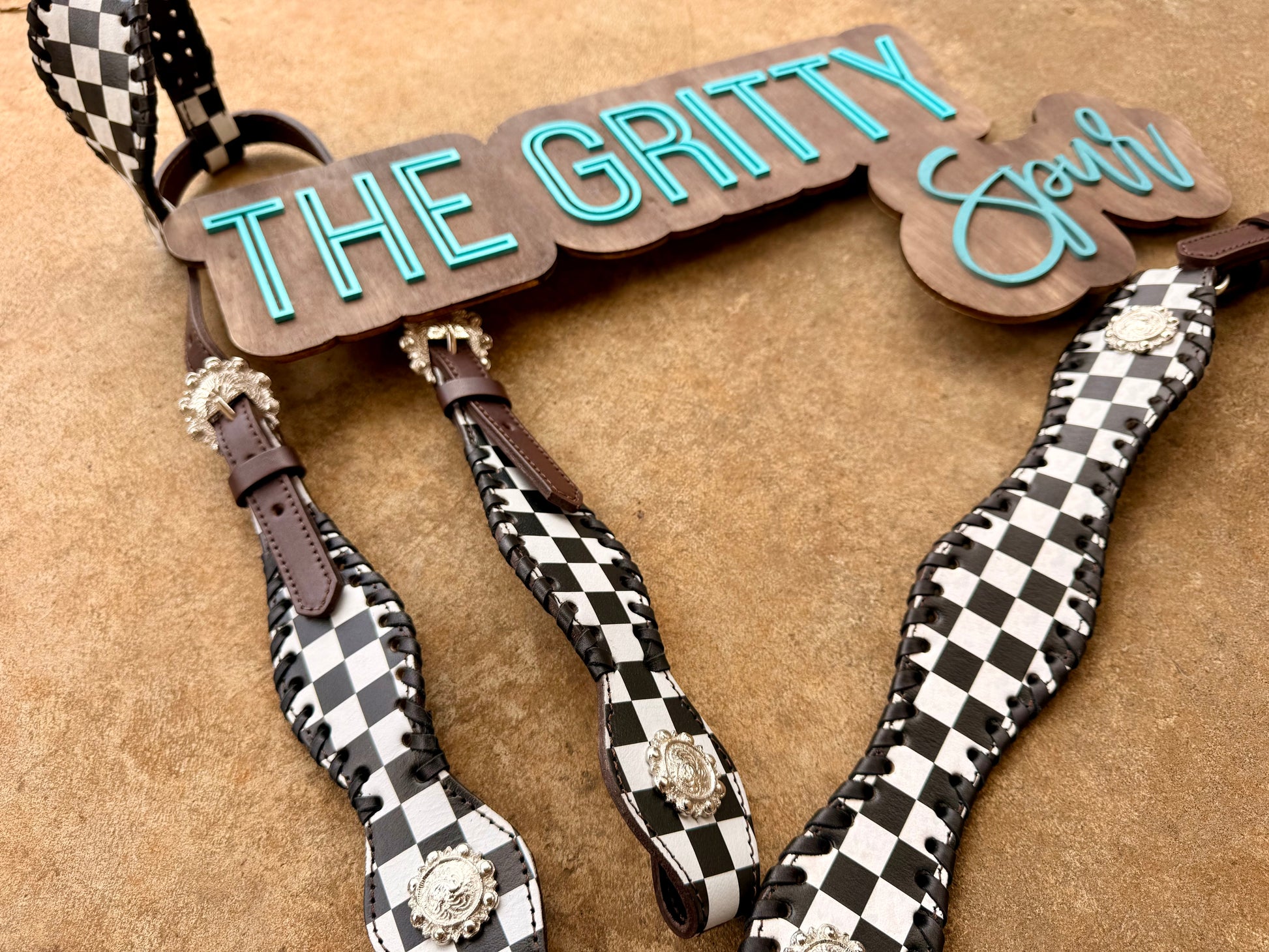 These tack sets are on some GORGEOUS very supple leather. They are so buttery soft! The print is printed right on the leather- they do not have an 'overlay' of leather. They are all horse sized, but custom sizes can be made if you message me.