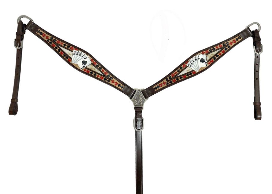 This headstall features a sliding one-ear, and adjustable crown to customize the placement to your horse. The one earpiece features the hand painted red & black card suits on the light brown leather. Featuring straight cheek pieces, and Chicago screw bit ends with silver berry conchos. This headstall features dual adjustments with large silver square buckles. The breast-collar is designed to fit comfortably on your horse, with adjustable straps to ensure a perfect fit. Featuring a tapered fit, nickel plated hardware, and tie down Dee.