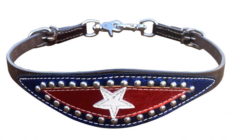 Leather wither strap with white star over a red metallic and blue snakeskin inlay. This wither strap features dark oil leather with white star design and a silver bead accent. Easily adjusts with 2 buckles 23"-30"
