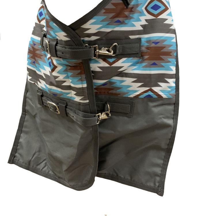 Prepare your horse for all types of weather and cold winter months with this waterproof and breathable turnout blanket! The fitted, contoured shape of this blanket along with the shoulder gussets allow the horse to move naturally while staying in place. Featuring a trendy southwest print, this blanket is made with an adjustable open front. Easily adjust the leg straps with stainless-steel nickel-plated bull snaps that will endure any weather.