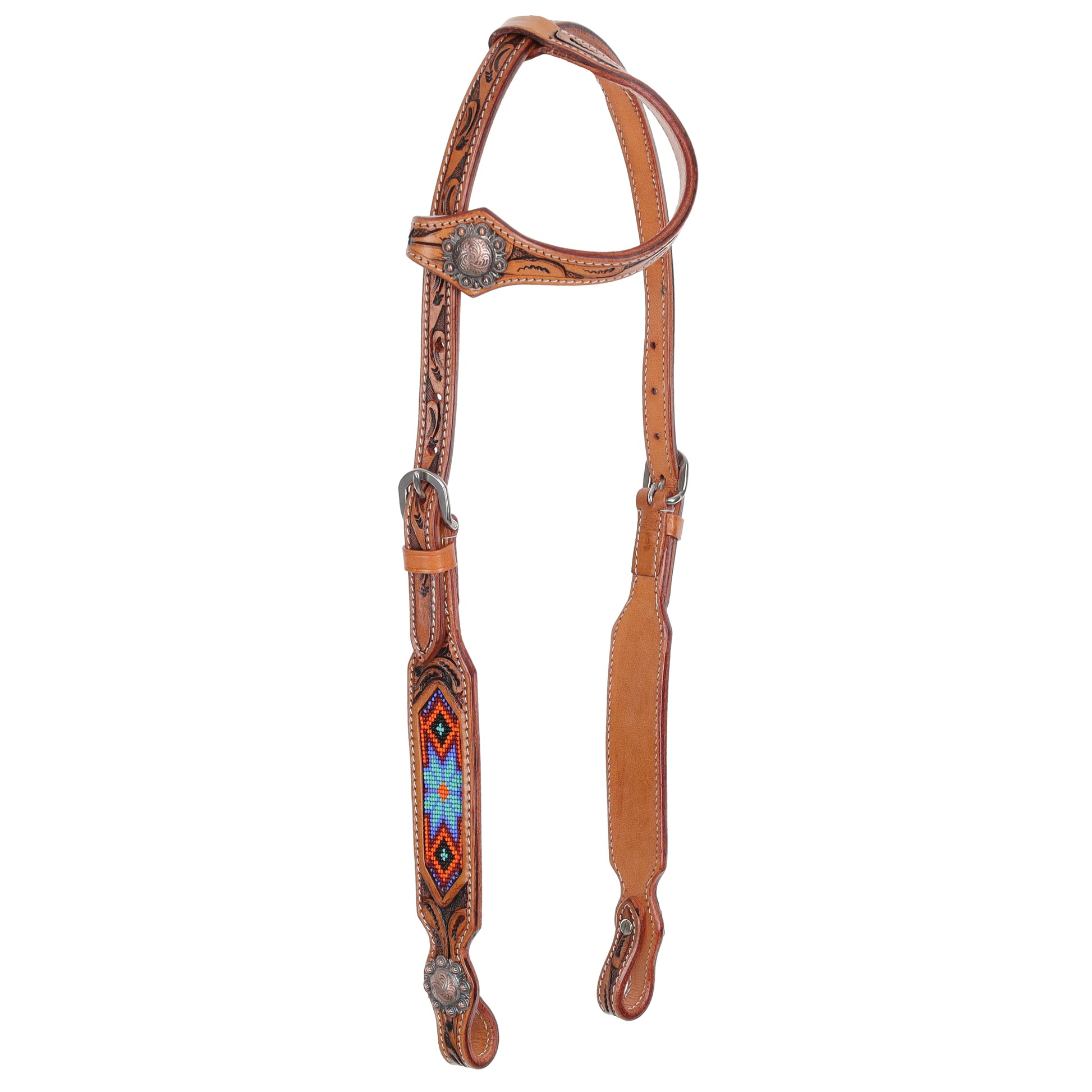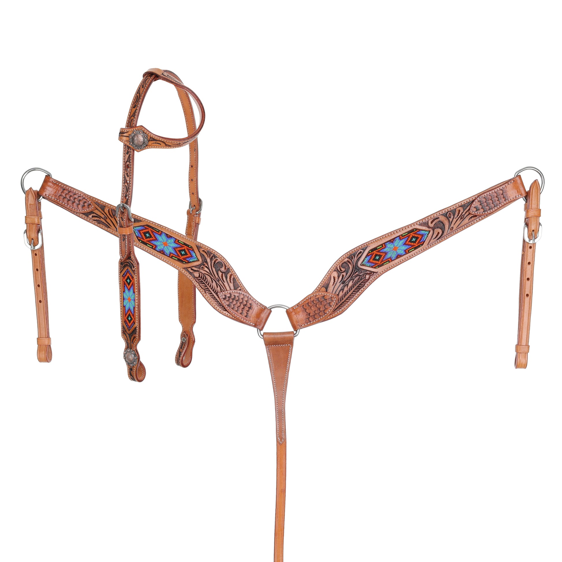 Spirit Star Set is a striking blend of craftsmanship, tradition, and western style. Made from rich, medium oiled leather, this set is accented with intricate leaf tooling, giving it a timeless, hand-crafted appeal. The bold beaded inlay, featuring teal, orange, burgundy, and black hues, adds a vibrant southwestern touch, making this set a standout piece for both the arena and the trails.