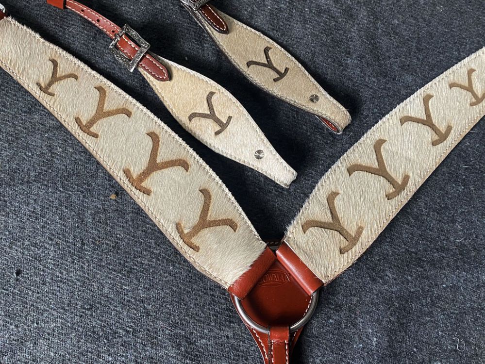 Hair on Cowhide One Ear Leather Cowhide 'Y' Brand Headstall and Breast Collar Set with silver dot accents.